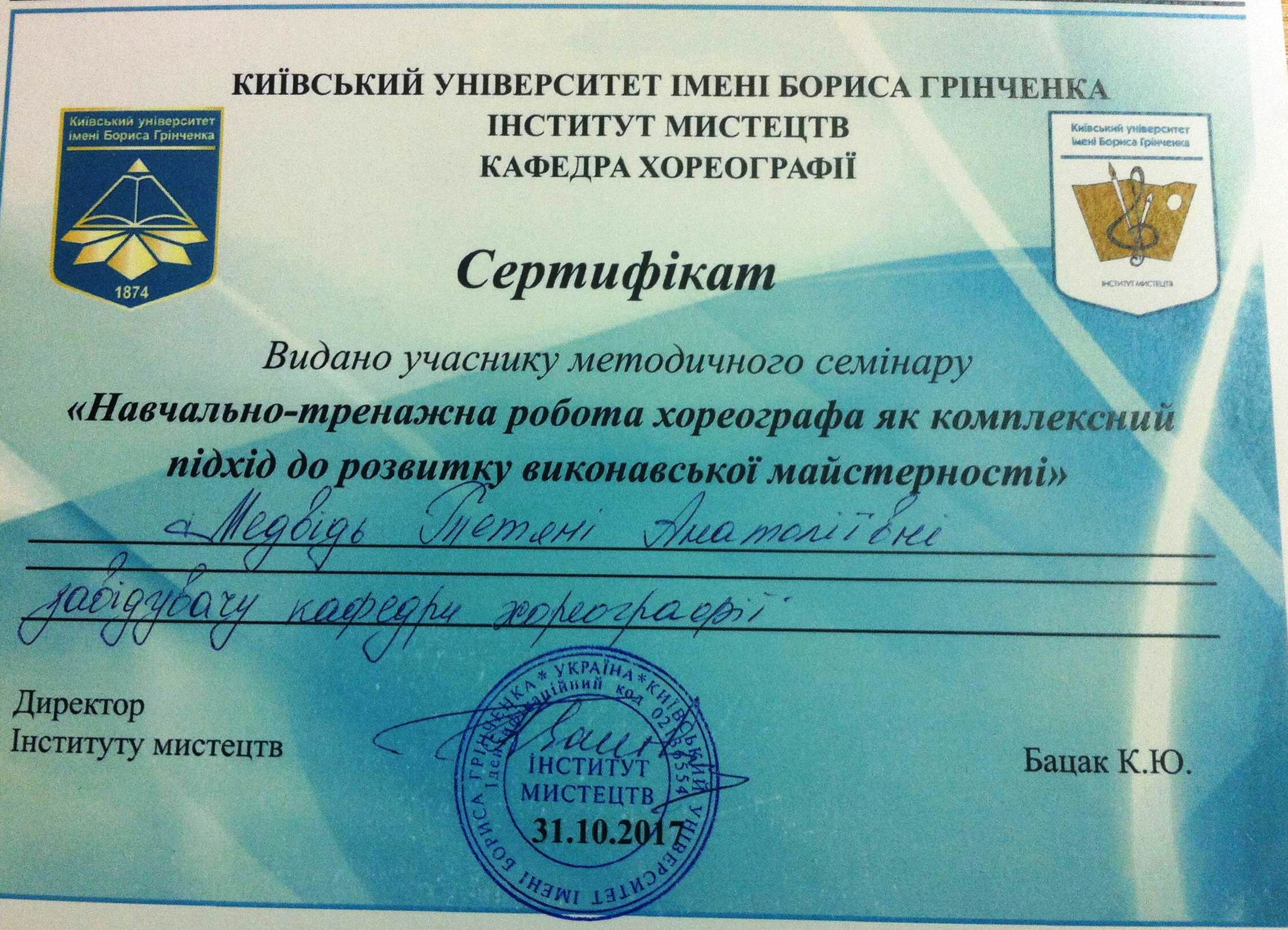 | 518 | Формування фахових компетентностей студентів-хореографів засобами тренажної роботи | Методичний семінар в рамках Фестивалю методик в Університеті Грінченка | Інститут мистецтв, б-р Ігоря Шамо 18/2 | 27.10.2016 00:00 | 2 |