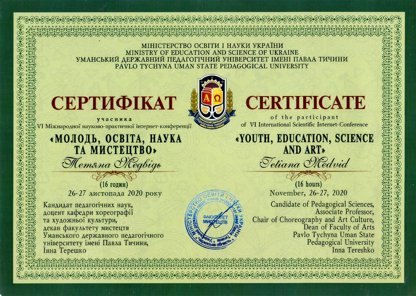 | 6464 | VI Міжнародна наукоао-практичної інтернет-конференції "Молодь, освіта, наука та мистецтво" | Формування аналітичних навичок студентів-хореографів під час вивчення дисципліни "Стилістика світового хореографічного мистецтва" | м. Умань |