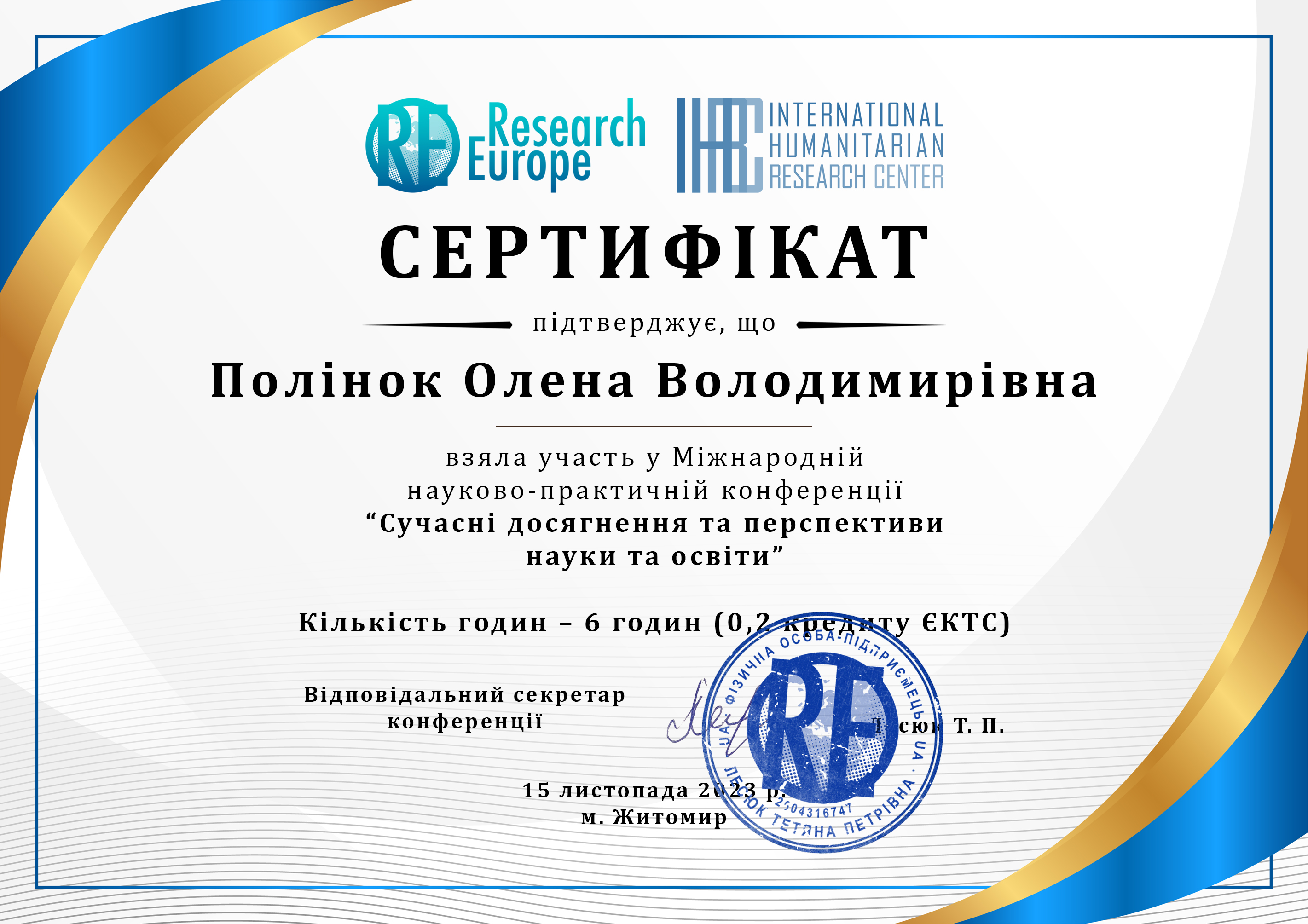 508 Університет Кошице, Словаччина Міжнародне стажування 01.03-14.04.2023 Не зазначено Prof. Peter Losonzci Учасник програми Сертифікат Полінок.pdf